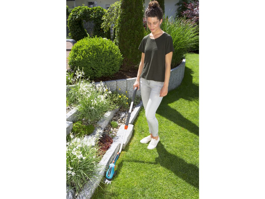 Kompletná súprava s teleskopickou rukoväťou a kolieskami – na pohodlné kosenie okrajov trávnika bez ohýbania