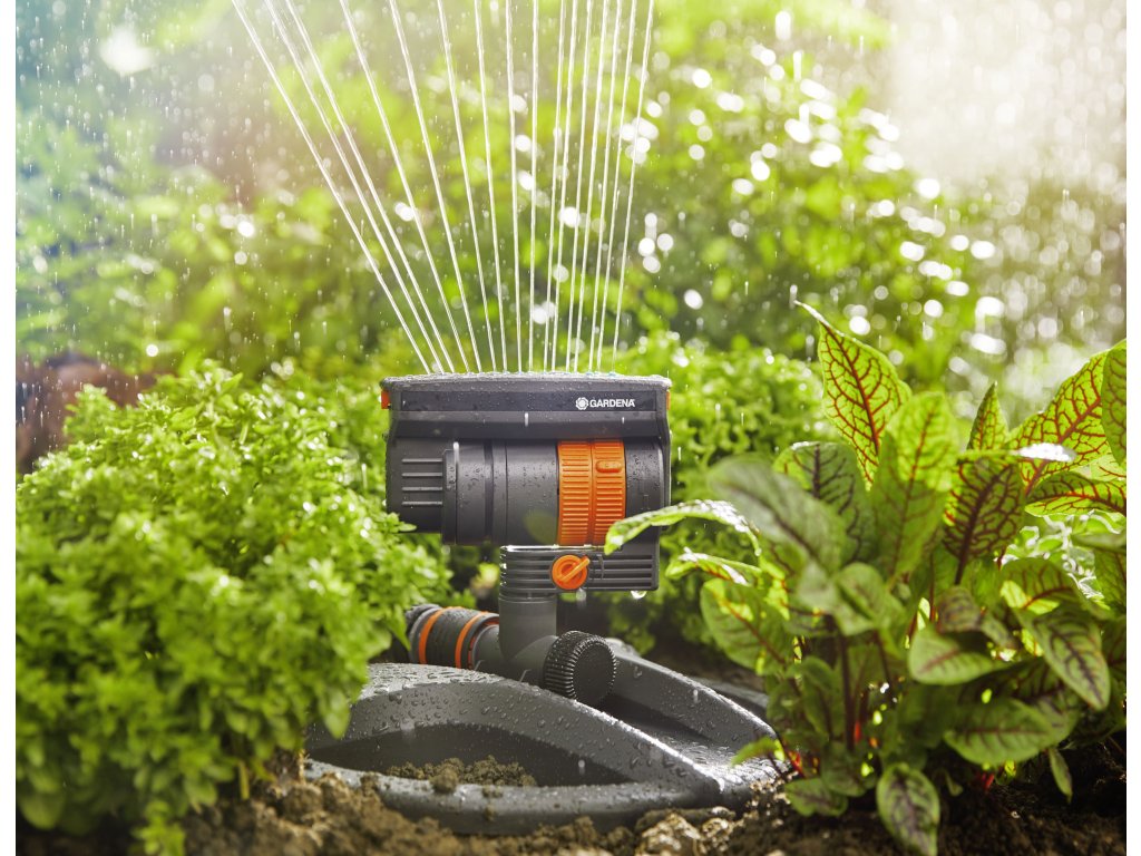 Guľatá základňa tohto zavlažovača nepretržite zabezpečuje jeho extrémnu stabilitu a pevný postoj na zemi. Vďaka tomu je vhodné umiestniť ho do stredu zeleninového záhonu, aby sa zalievali rastliny okolo neho. Týmto spôsobom postrekovač pokryje plochu 9 až 216 m². Posuvníky umožňujú nastaviť dosah (3-18 metrov), šírku postreku (3-12 metrov) a prietok vody.